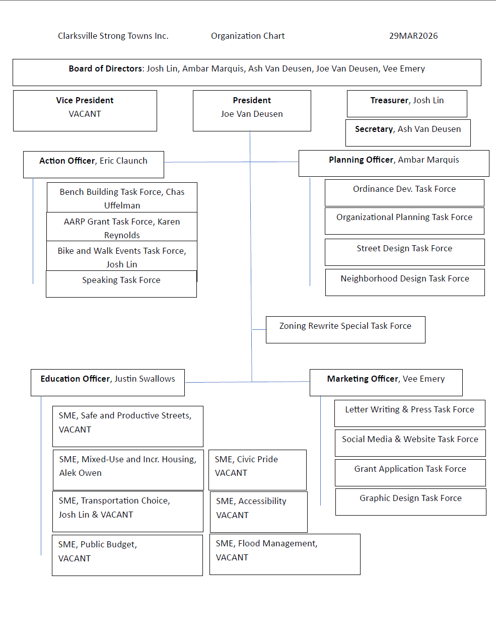 Action Officer: Organizes various action-oriented task forces, such as: internal events, community events, volunteerism, tactical urbanism, attending/speaking at public meetings, organizing members and affiliates to commit action. May delegate Task Force leadership.